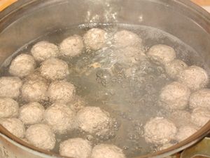 Я решил варить суп с фрикадельками, можно использовать и обычный мясной бульон. По рекомендации одной из читательниц сайта я добавил в фрикадельки манку, чтобы они стали нежнее. Поставил вариться вторичный бульон на фрикадельках. Время варки бульона буквально 10-15 минут и можно начинать его заправлять.